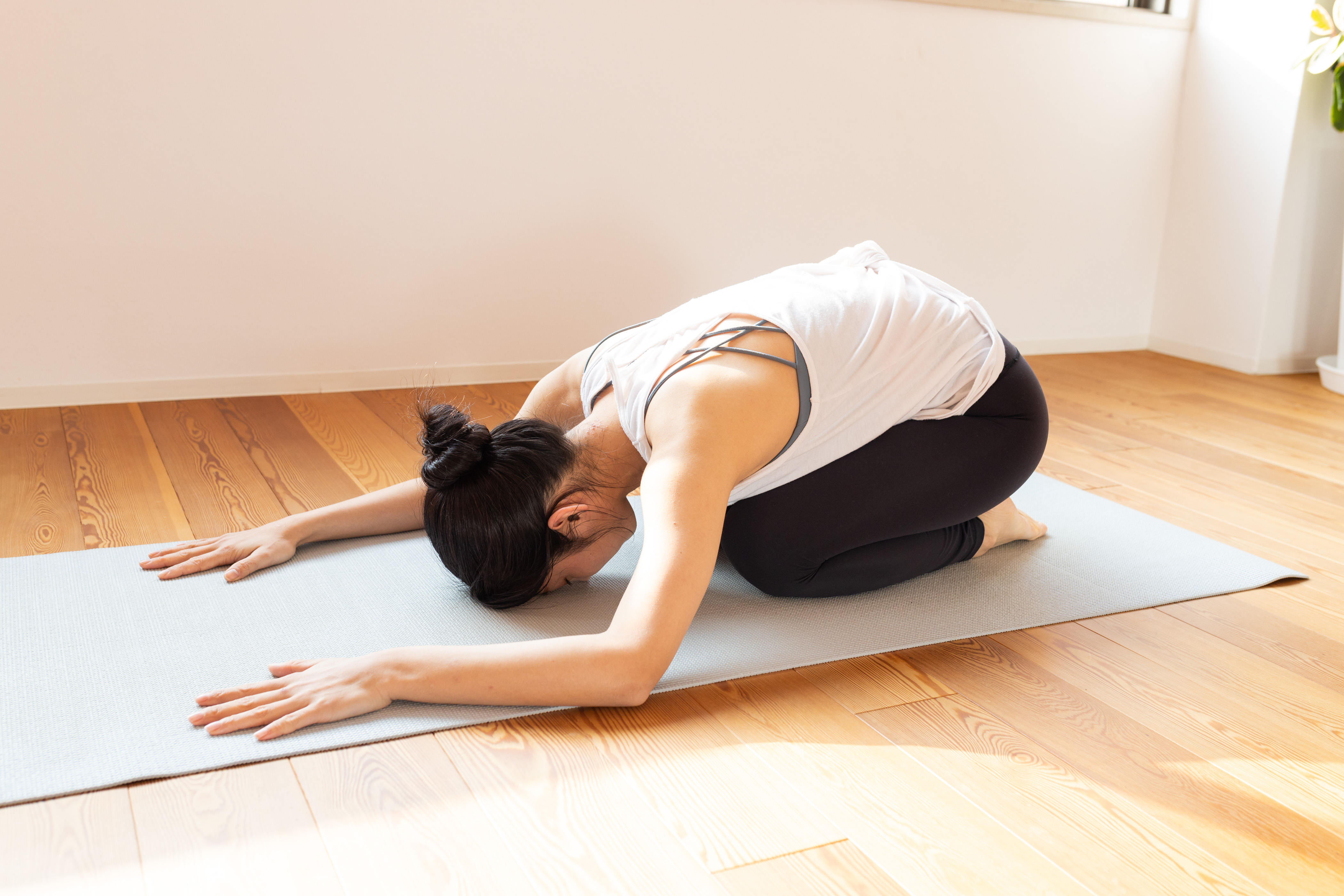 4.お尻を後ろに引き、おでこを床につけたまま正座のような姿勢に。手も楽に伸ばしてリラックスしましょう。